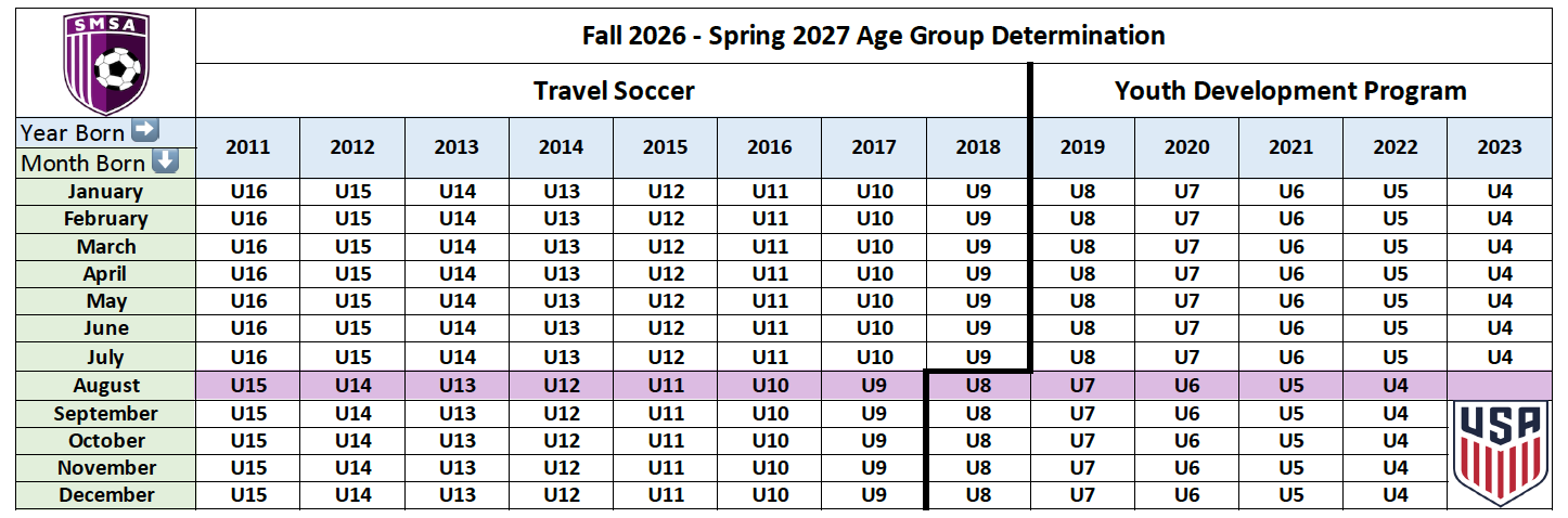 U.S. Youth Soccer will be moving to a school age grouping that runs from August 1st through July 31st in the Fall of 2026. U.S. Youth Soccer decided to go with this grouping to better align the age groups with grade levels in school, meaning that the kids will play with kids that normally go to school with. South Middleton Soccer Association will be moving to this grouping a year early to start preparing for the formal change in the Fall of 2026. South Middleton Soccer Association, along with our league and state associations, utilize the same method for determining eligibility for programs and team placement. Age groups apply for a full soccer year which includes both Fall, Winter and Spring seasons, and is determined based on the child’s birth year and birth month.