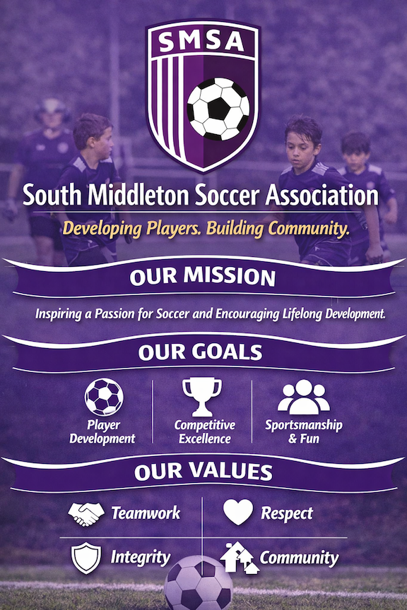 The mission of South Middleton Soccer Association (SMSA) is to develop players of all abilities by providing a positive, structured, and high-quality soccer experience. SMSA is committed to fostering player growth through age-appropriate training, strong coaching support, and opportunities for players to learn, compete, and enjoy the game.